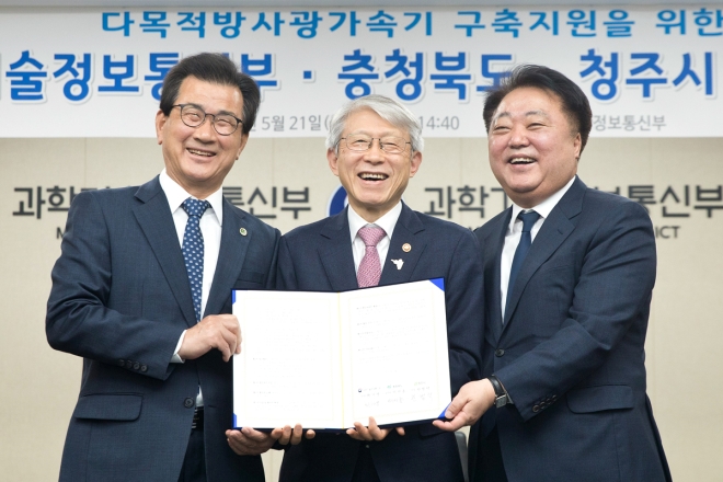 과학기술정보통신부(이하 ‘과기정통부’)와 충청북도(도지사 이시종), 청주시(시장 한범덕)는 5월 21일(목) 오후 ‘다목적 방사광가속기 구축 지원을 위한 과기정통부-충청북도-청주시 간 업무협약(MOU)’을 체결했다고 밝혔다.