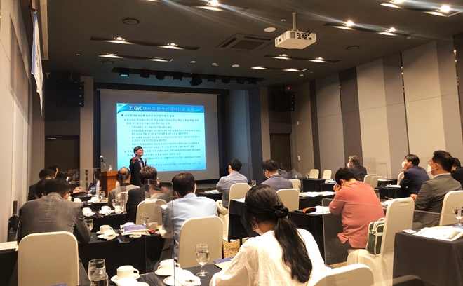 첫 번째 발표를 진행한 조철 선임연구원은 미중 무역 분쟁과 일본 수출규제, 코로나19 등의 국제적 이슈로 산업통상환경 변화와 GVC 재편에 대해 설명하며, 그에 따른 국내 산업계의 대응 방안을 소개했다.