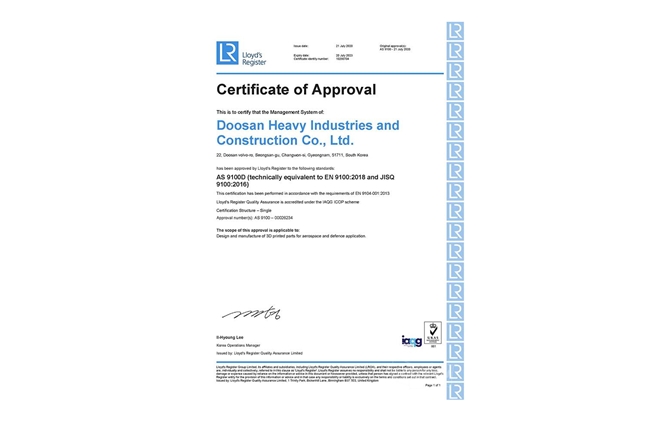 이번에 두산중공업이 획득한 인증의 범위는 항공, 우주 및 방위산업 부문에 대한 3D프린팅 개발 및 제조 분야다.
