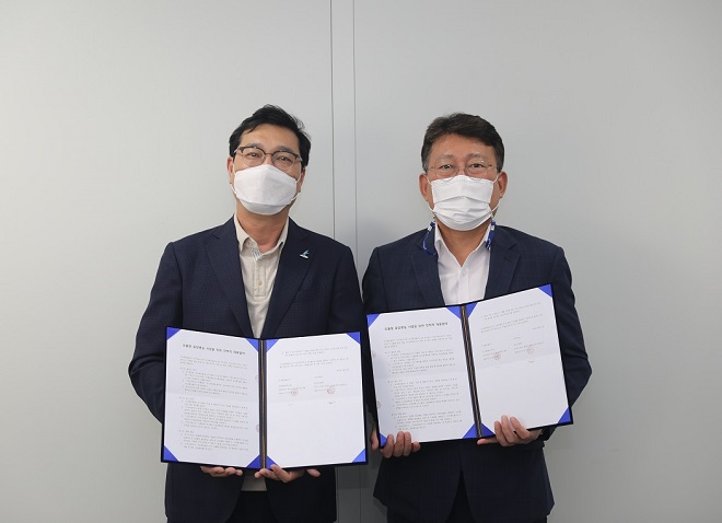 ▲ 왼쪽부터 코오롱모듈러스 강창희 상무, 신성이엔지 이영일 전무(사진 : 코오롱모듈러스)