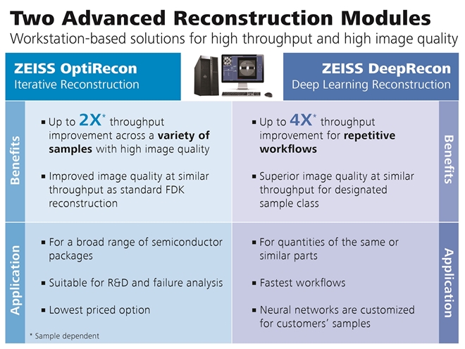 자이스의 툴박스는 2개의 신형 어드밴스드 재구성 엔진인 OptiRecon과 DeepRecon을 제공한다. 이들 엔진은 반도체 고급 패키징 불량 및 구조 분석을 위해 화질을 그대로 유지하거나 또는 향상된 CNR(contrast-to-noise ratio)로 화질을 더욱 향상시키면서 더 빠른 스캔 속도를 실현한다.
