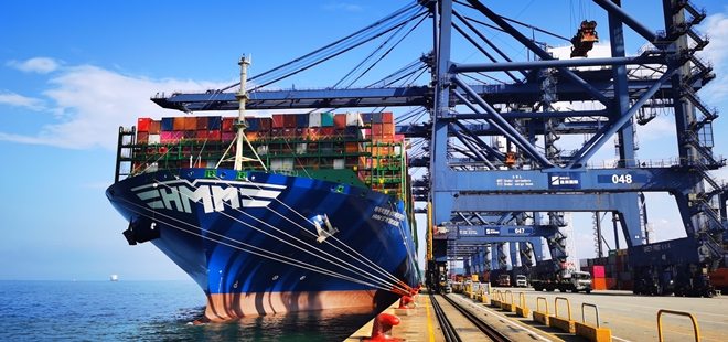 ▲중국 옌톈(Yantian)에서 12호선 ‘HMM 상트페테르부르크(St Petersburg)’호가 출항을 준비하고 있다.