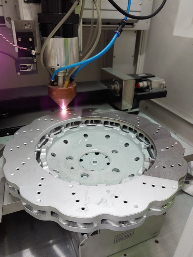 ▲3D레이저 프린트로 철에 세라믹(짙은 회색 부분)이 섞인 자동차 디스크 브레이크를 제작하고 있다.