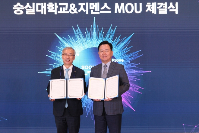 ▲(왼쪽부터) 황준성 숭실대 총장, 오병준 지멘스 디지털 인더스트리 소프트웨어 코리아 대표이사