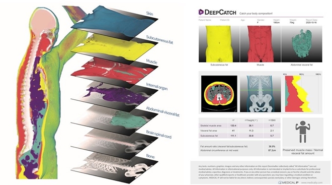 딥캐치는 한 번의 클릭만으로 온몸의 체성분을 자동 분석해주는 제품이다. 전신 CT영상에서 1분 내 피부, 뼈, 근육, 내장지방, 피하지방, 장기, 뇌척수 등 체성분을 7개 구조물로 분할 및 분석해준다.
