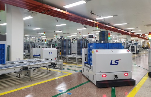 ▲ LS일렉트릭 청주 스마트공장에서 무인운반차량(AGV)가 제품을 싣고 이동하고 있는 모습
