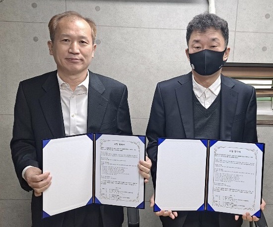 ▲ (사)한국M&A협회 이종한 회장(왼쪽)과 ’한국마스크산업협회 석호길회장이 협약식을 하고 기념사진을 찍고있다.