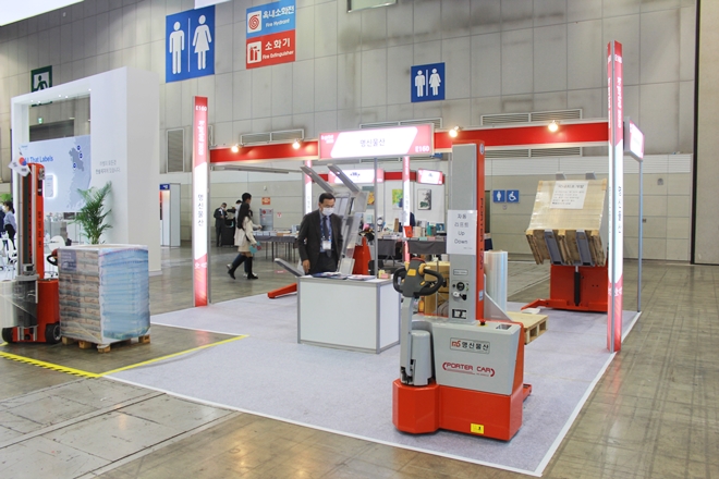[K-PIRNT 2020] 명신물산, 효율적인 물류 작업 가능한 랩핑로봇·전동리프트 선보여