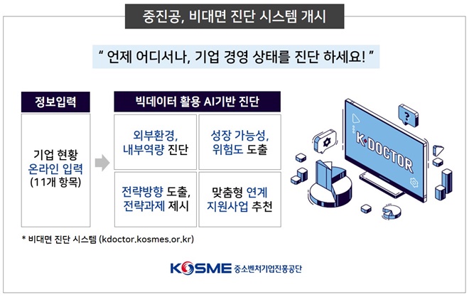 김학도 이사장은 “비대면 진단 시스템은 장소와 시간, 횟수에 제한 없이 언제 어디서든 무료로 이용 가능한 것이 장점”이라며 “중진공만의 진단 방법론과 노하우, 빅데이터를 적극적으로 활용해 기업의 경영 위기를 예방하고 맞춤형 애로 해결까지 지원하겠다”라고 전했다.