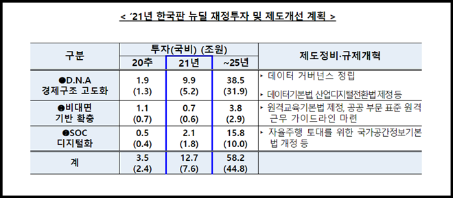 정부는 2020년 3차 추경으로 사업을 개시한 후, ▲데이터·네트워크·인공지능(이하 D.N.A) 생태계 강화 ▲비대면 산업 육성 ▲교육·SOC 디지털화를 통해 경제위기 극복과 선도국가 도약을 위한 노력을 기울이고 있다.