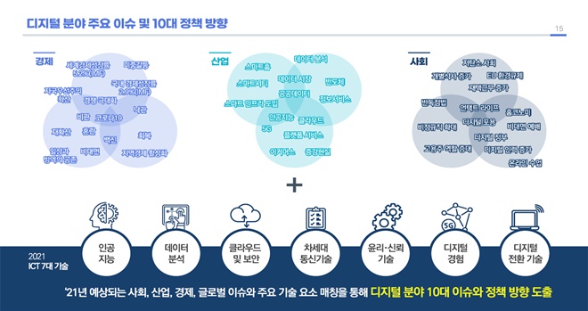 한국지능정보사회진흥원(NIA)은 21년 디지털 분야 10대 이슈를 선정하고 이슈별 대응을 위한 정책 방향을 제시했다.