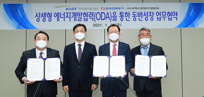 한국전력(이하 한전)이 22일 서울 한전 아트센터에서 한국산업기술진흥원(이하 KIAT), 나주혁신산단 입주기업협의회(이하 협의회)와 ‘에너지산업협력개발지원사업 업무 협약’을 체결했다.