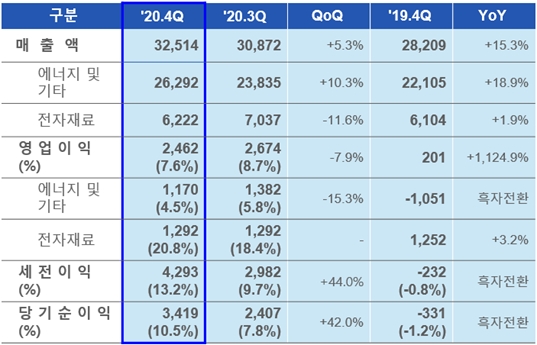 세부적으로 작년 4분기 에너지 부문의 매출은 2조 6292억 원으로 전분기 대비 2457억 원(10.3%) 증가했고, 영업이익은 1170억 원으로 전분기 대비 212억 원(15.3%↓) 감소했다.