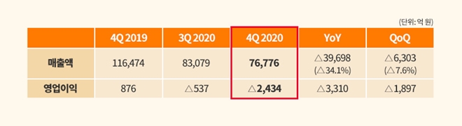 4분기 실적에 따라 연간 매출은 34조1645억 원, 영업손실은 2조5688억 원을 기록하게 됐다.