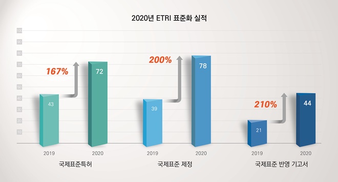 이번 성과는 전년 대비 표준특허는 167%, 국제표준 제정은 200% 성장한 수준이다. 코로나19로 인해 대부분의 국제회의가 비대면으로 전환된 상황을 감안해도 국내 기관 중 최고 수준의 국제표준화 실적을 기록했다고 ETRI는 전했다.