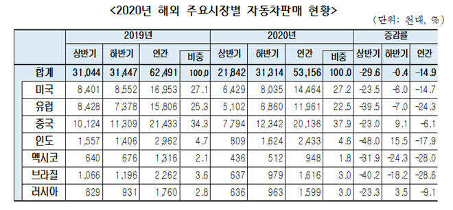보고서에 따르면, 2020년 해외 주요시장의 자동차 판매는 코로나19로 인해 전년 대비 14.9% 감소한 가운데, 하반기에는 전년 수준을 회복했으나 국가별 코로나19 확산 정도와 내수부양책 시행 등에 따라 시장별 회복 속도는 차이가 있었다.