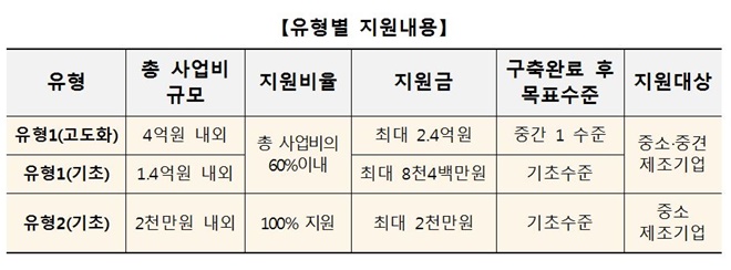 참여 기업은 지원유형에 따라 총사업비의 60% 내에서 최대 8천 4백만 원부터 2억 4천만 원까지 사업비를 지원받을 수 있고, 기초 수준은 2천만 원의 사업비를 100% 지원받을 수 있다.