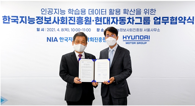 현대자동차그룹이 한국지능정보사회진흥원(이하 NIA)과 손잡고 자동차 분야 인공지능(AI) 학습용 데이터의 활용 및 확산에 앞장선다.