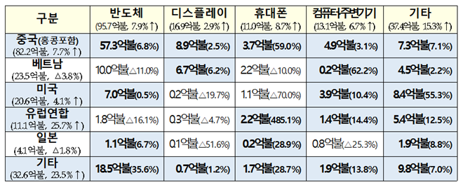 주요 지역별로 보면, 중국(홍콩포함, 7.7%↑), 미국(4.1%↑), 유럽연합(25.7%↑)등에서 수출이 증가했고, 베트남(3.8%↓), 일본(1.8%↓)에서는 감소했다.