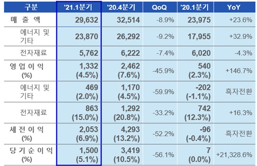 ▲삼성SDI 2021년 1분기 실적. (단위 : 억원) (출처 : 삼성SDI)