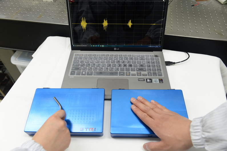 지난 4월 ETRI 연구진은 압전 소재와 센서, 액추에이터 등을 이용해 15m 거리 밖에서 금속이나 플라스틱, 고무와 같은 사물의 촉질감을 느끼는 데 성공했다고 밝혔다. 해당 연구는 기능성 신소재 분야의 학술지 ‘어드밴스드 펑셔널 머티리얼즈’에 게재됐다.