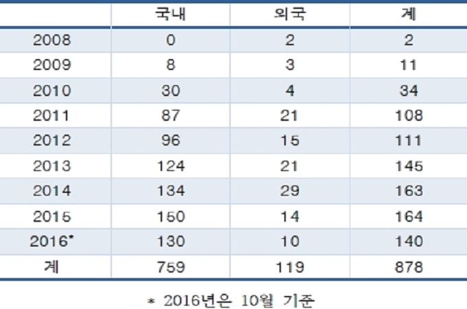 출원인별로는 중소기업 280건(31.9%), 대기업 189건(21.5%), 개인 160건(18.2%), 대학 및 연구기관 121건(13.8%), 외국인이 119건(13.6%)을 출원한 것으로 조사됐다.