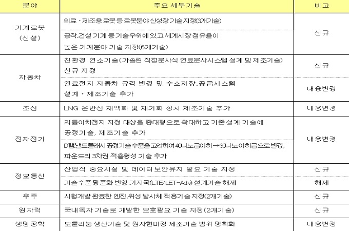 이번 개정에서는 신성장산업인 의료·제조용 로봇 및 공작건설·기계 등 기계·로봇 분야가 신설됐다. 또한, 자동차(1개), 원자력(2개), 정보통신(1개), 우주(2개) 분야의 핵심기술을 신규지정했고, 이차전지, 조선 등의 분야는 기존 지정기술의 범위가 확대됐다.
