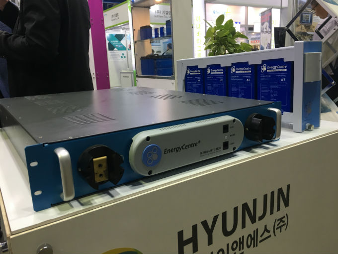 현진이앤에스가 이번 전시회에 선보인 ‘에너지센터(EnergyCentre)’ 솔루션은 ESS 서비스로서, 여기에는 HBS(하이브리드 배터리 시스템), PCS(전력 컨버젼 시스템), EMS(에너지 관리 시스템), PMS(전력 관리 시스템) 등이 포함된다.