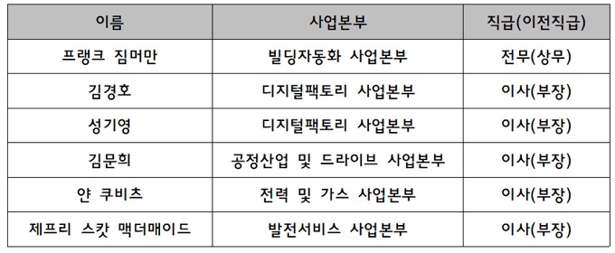 이번 승진자 명단에는 프랭크 짐머만 빌딩자동화 사업본부 전무를 비롯하여 총 6명의 이사급 이상 임원들이 포함됐다.