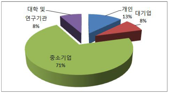 출원인별 동향을 살펴보면, 내국인이 전체 출원 비율의 약 87.7%를 차지하고 있으며 중소기업이 100건(64.9%), 개인이 21건(13.6%), 대기업이 17건(11.0%), 대학 및 연구기관이 16건(10.4%)을 출원한 것으로 조사됐다.