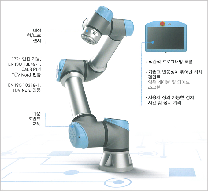 협동로봇 e-시리즈는 유니버설의 획기적인 기술을 지속적으로 개선한 결과물로, 다양한 애플리케이션의 개발 속도를 앞당길 수 있는 기술 및 최신 ISO 안전 표준을 준수하는 기술 등이 포함되어 있다.