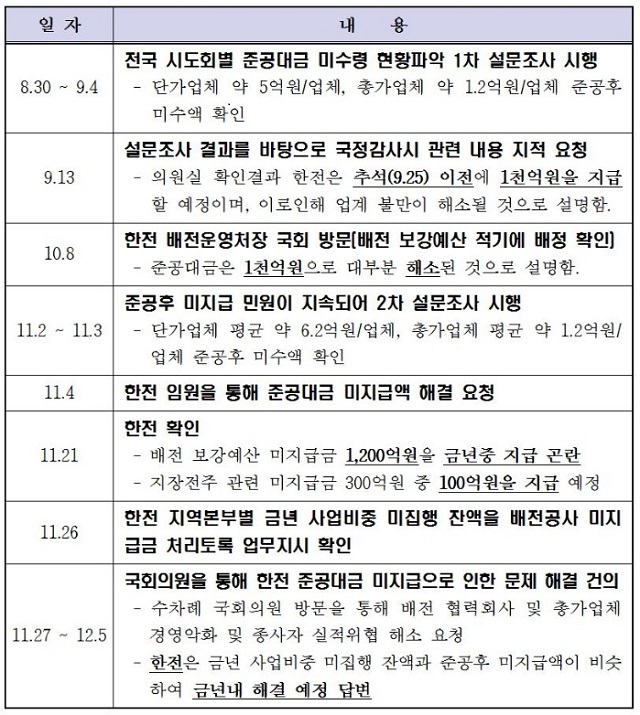 ▲ 한국전기공사협회가 추진한 한전의 배전 협력회사 공사비 지급 경과 현황 <한국전기공사협회 제공>