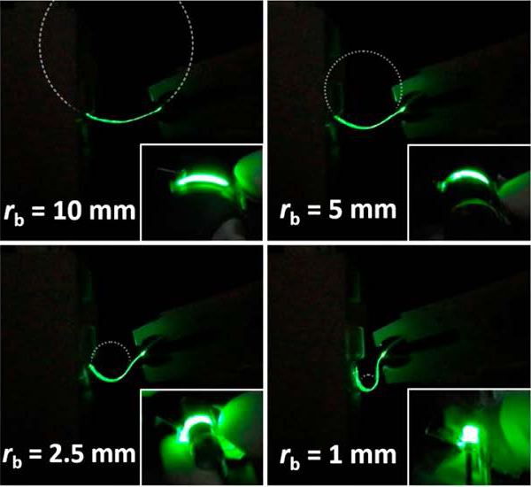 ▲굽힘 곡률이 작아져도 성능을 유지하는 유연 반투명 PeLED <사진 : UNIST 제공>