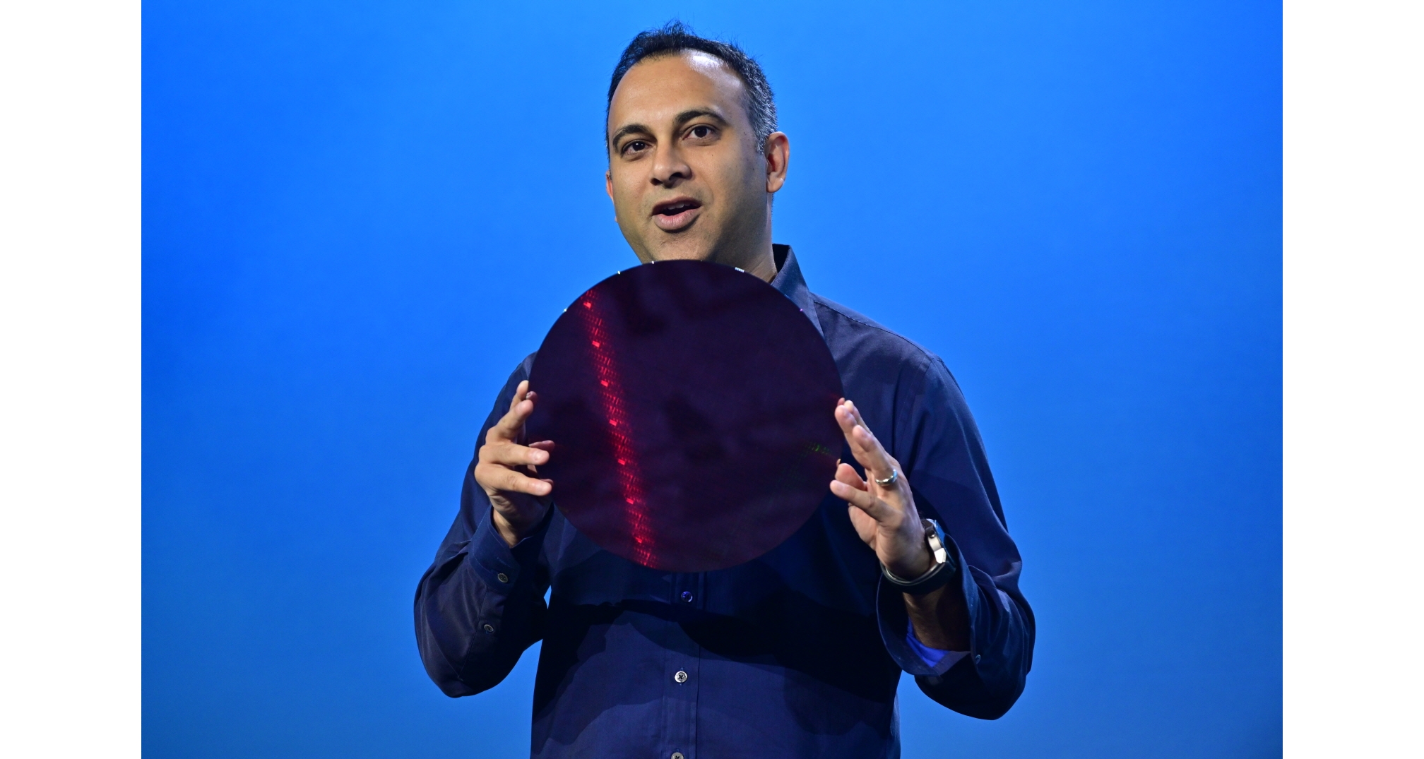 ▲ 나빈 셰노이(Navin Shenoy) 인텔 총괄 부사장 겸 데이터센터 그룹 총괄 매니저가 4월 2일 데이터센트릭 포트폴리오 발표 키노트에서 인텔 제온 프로세서가 담긴 웨이퍼를 들고 있다.