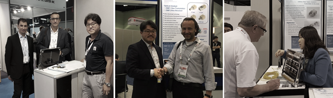 ▲ 옵토마린이 미국 샌디에고에서 개최된 OFC2019에서 해외판로 개척을 위해 외국담당자들에게 기술을 설명하고 있는 모습.