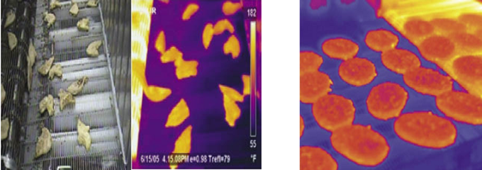 ▲ 오븐구이 식품이나 전자레인지 조리육의 조리 온도 검사 장면. 고정형 열화상 카메라가 연속 컨베이어 오븐에서 조리되어 나온 닭고기 살과 조리육의 온도를 측정 중이다.