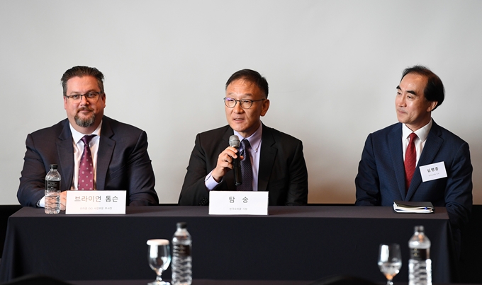 ▲ 이달 3일 코엑스 인터컨티넨탈 호텔에서 진행된 오라클 국내 데이터센터 설립 기자간담회에서 오라클 관계자들이 기자들과 질의응답 시간을 갖고 있다. (왼쪽부터) 브라이언 톰슨 오라클 OCI 사업부문 부사장, 탐 송 한국오라클 사장, 심명종 한국오라클 솔루션 엔지니어링 총괄 및 OCI 담당