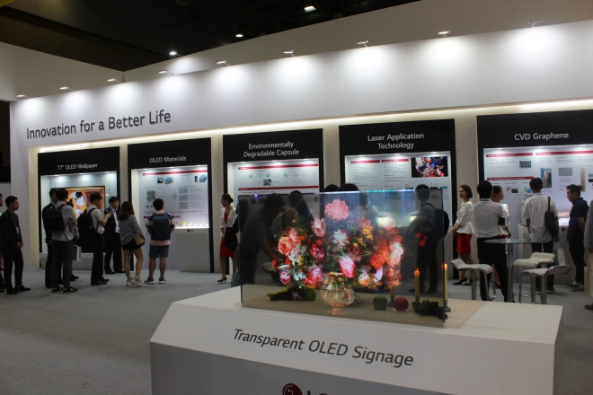 LG는 이번 전시회에서 자체 개발한 '투명 올레드(OLED) 사이니지'를 공개했다. 투명 올레드 사이니지는 투명한 디자인으로 만들어져 디스플레이 뒤편까지 한눈에 볼 수 있는 모니터다. 부스를 방문한 참관객은 디스플레이를 투과해 뒤편에 장식된 사물을 신기하게 바라봤다.