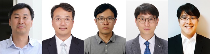 ▲ 왼쪽부터) 명지대학교 윤태식 교수, 홍익대학교 김태경 교수, 고려대학교 세종캠퍼스 김휘 교수, 부산대학교 김창석 교수, KIST 유용상 교수