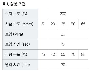 성형품의 성형에는 형체력 1,764kN, 스크류 지름 ø40mm의 전동 서보 사출성형기(東洋기계금속제, Si-180Ⅲ)를 사용, 표 1에 나타냈듯이 사출 속도 및 금형 온도를 변화시켜 성형을 했다. 공시재료는 폴리프로필렌(프라임폴리머, J-3021 GR)을 사용했다.