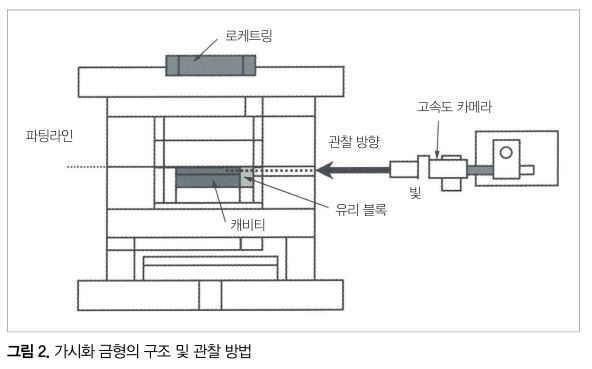 싱크량에 주는 수지유동의 영향을 상세하게 검토하기 위해 그림 2에 나타낸 금형 캐비티의 측면부에 관찰용 유리 블록을 설치한 가시화 금형을 사용해 캐비티 내를 흐르는 수지의 유동 거동을 고속도 카메라로 관찰했다. 관찰 위치는 성형품 측면의 리브 접촉부이다.