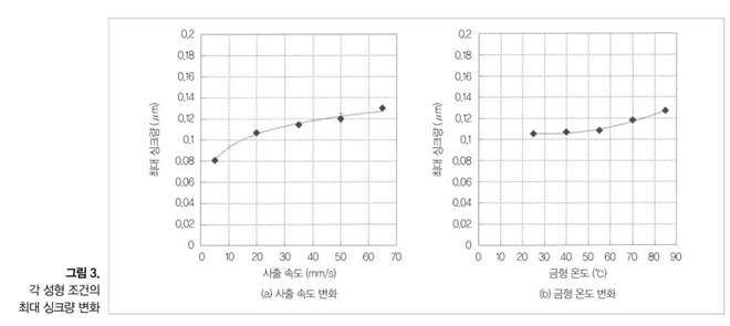 레이저 변위계에 의해 측정된 변위계에서부터 성형품까지의 거리 최대값과 최소값 차이를 최대 싱크량으로 정의하고, 각 성형 조건의 최대 싱크량 변화를 구했다. 그 결과를 그림 3에 나타냈다. 동 그림 (a)에 나타낸 사출 속도를 변화시킨 조건에서는 사출 속도가 높아짐에 따라 최대 싱크량이 커지고 있다.