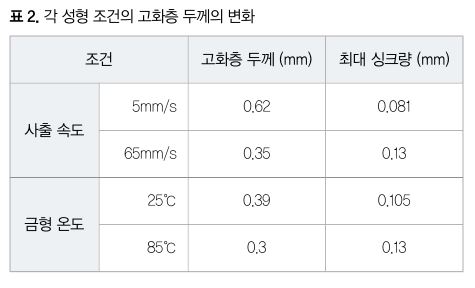 앞에서 서술했듯이 사출 속도나 금형 온도가 리브 싱크에 영향을 주는 것이 확인됐다. 이 원인을 검토하기 위해 각 조건의 성형 중 수지유동 거동을 가시화 관찰하고, 수지 충전 완료 시의 고화층 두께를 구했다. 그 결과를 표 2에 나타냈다. 사출 속도나 금형 온도를 변화시킴으로써 충전 완료 시의 고화층 두께가 변화한다는 것을 알 수 있다.