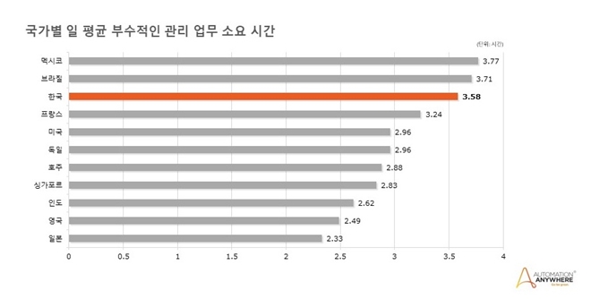 한국은 설문 조사 대상인 11개국 가운데 부수적인 관리 업무에 소요하는 시간이 비교적 많은 것으로 나타났다. 설문에 따르면, 한국 사무직 근로자는 멕시코(3.77시간), 브라질(3.71시간)에 이어 부수적인 관리 업무 일 평균 소요 시간(3.58시간)이 3번째로 많았다.