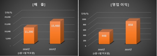 2018년 대비 매출액 약 1조5460억으로 16% 상승, 영업이익 약 858억으로 15% 상승