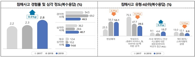 기업들의 침해사고 경험률은 2.8%이며, 침해유형은 랜섬웨어(54.1%)가 여전히 높고 악성코드(39.5%, 8.2%p↓)는 감소했으며, 해킹(13.7%, 9.3%p↑)이 증가하는 경향을 보였다.