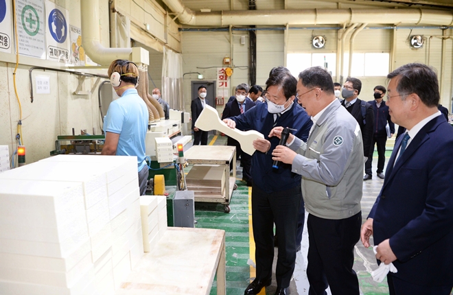 성윤모 산업부 장관은 지난 24일(금) 13시, LNG 저장 및 수송용 극저온 단열패널 및 자동차․항공․조선 관련 탄소섬유, 유리섬유 등 복합재료를 생산하는 한국카본 생산 2공장(경남 밀양)을 방문해 현장점검을 실시했다.
