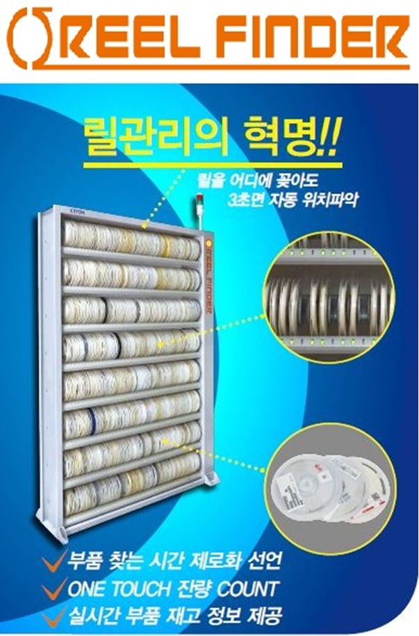 릴 파인더는 릴 자재에 부착된 RFID 센서 태그가 선반에 탑재된 RFID 리더 안테나를 통해 인식되면서 재고 현황 및 위치 정보를 실시간으로 연동한다. 또한 적재된 릴에 각각의 LED 인디게이트를 적용해 위치를 표시해줌으로써 부품 찾는 시간을 단축시켜 준다.
