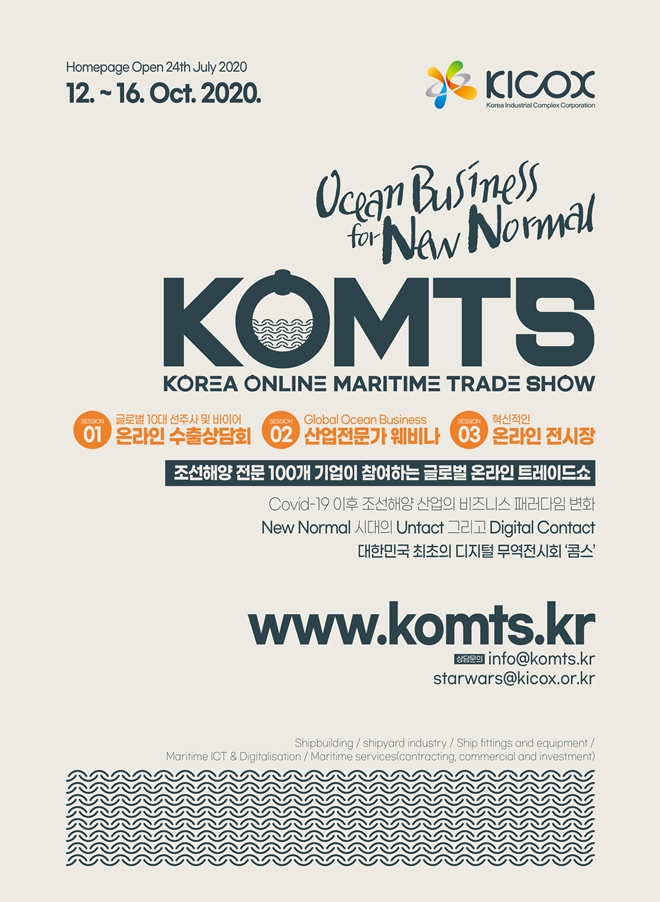 한국산업단지공단(이하 산단공)이 산업계 최초로 디지털 가상 전시관을 구축하고 글로벌 글로벌 선주사와 구매 대행사를 초청하여 ‘2020 한국 온라인 조선해양 무역 전시회’(2020 Korea Online Maritime Trade Show)를 개최한다고 밝혔다.