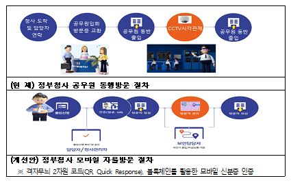 하지만 앞으로는 방문 전 휴대전화로 신청해 QR코드를 발급받으면 별도 절차 없이 QR코드 인증만으로 청사 출입이 가능하다.
